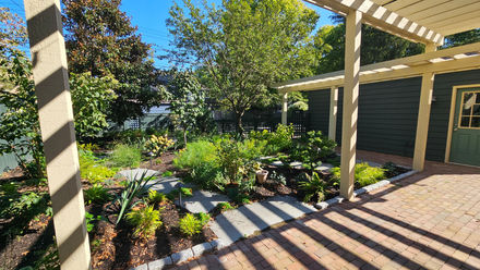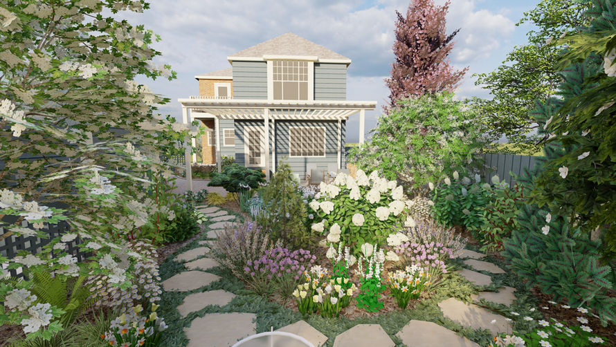 A backyard transformation from lawn and boxwood to a vibrant garden. Plant selections provide interest to be enjoyed for all four seasons. Phase 2 of this project to be installed fall of 2024 with metal lattice work and a large variety of spring bulbs.